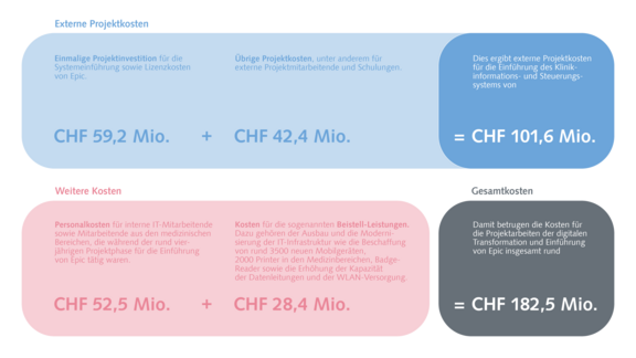 Die Kosten für das neue Klinikinformations- und Steuersystem von Epic beträgt für zehn Jahre rund 104,2 Millionen Franken. Nebst den einmaligen Kosten des Einführungsprojektes und von Lizenzkosten von 59,2 Millionen Franken sind darin zusätzlich Betriebs- und Wartungskosten bis 2032 im Umfang von insgesamt rund 45 Millionen Franken eingeschlossen. Die ursprüngliche Offerte und der Zuschlag betrugen rund 83 Millionen Franken. Darin nicht enthalten waren die Mehrwertsteuer, die exakten Nutzungszahlen (Fälle und Nutzer:innen sind gestiegen) sowie einzelne Module und Schnittstellen, die im Laufe der Einführung zusätzlich bezogen wurden.