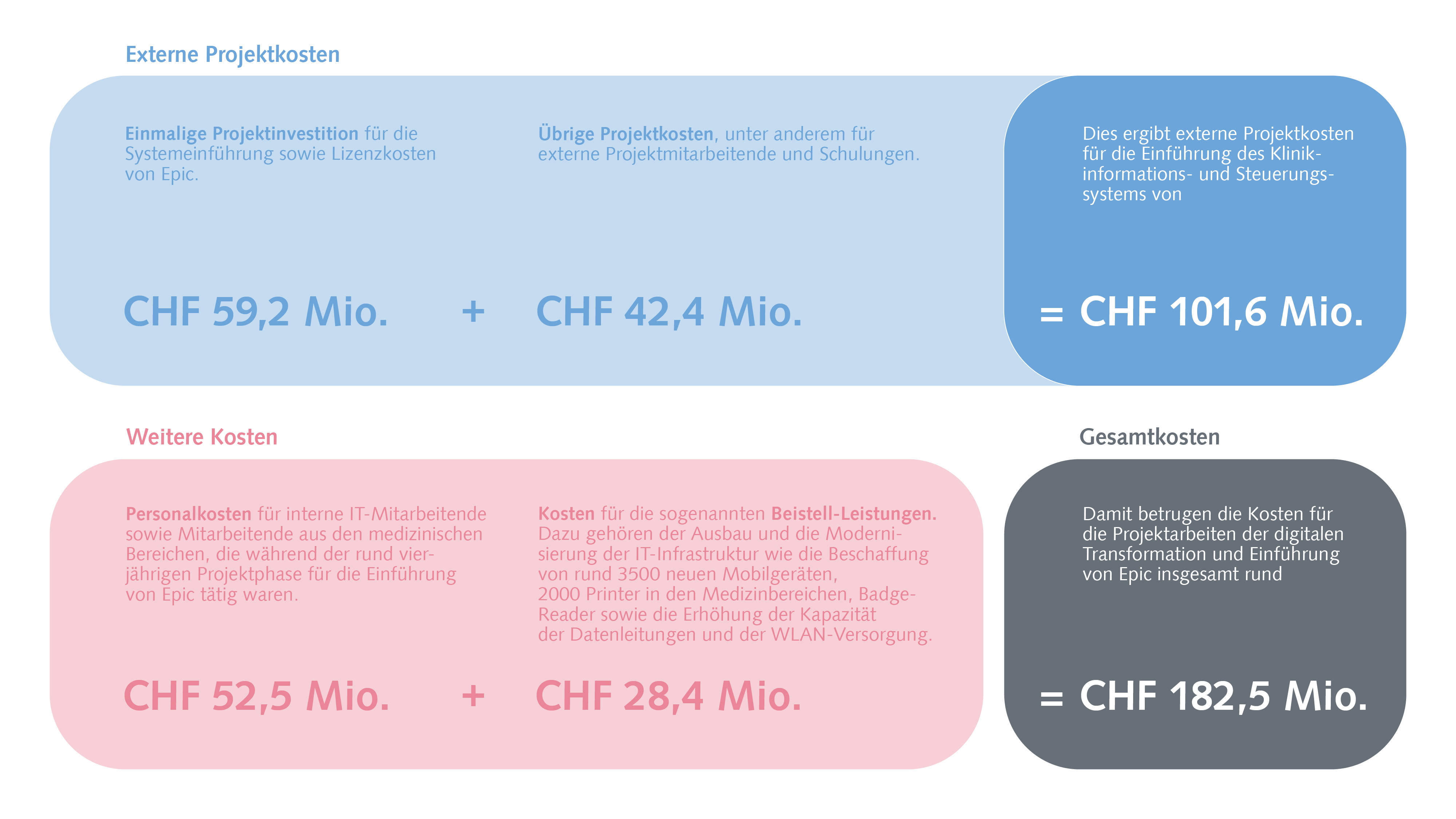 Der publizierte Zuschlag auf der öffentlichen Beschaffungsplattform simap von rund CHF 83 Mio. umfasst die Lizenz- und Einführungskosten von Epic sowie Wartungskosten für die Jahre 2023-2032. Darin nicht enthalten waren die Mehrwertsteuer, die exakten Nutzungszahlen (Fälle und Nutzer:innen sind gestiegen) sowie einzelne Module und Schnittstellen, die im Laufe der Einführung zusätzlich bezogen wurden.